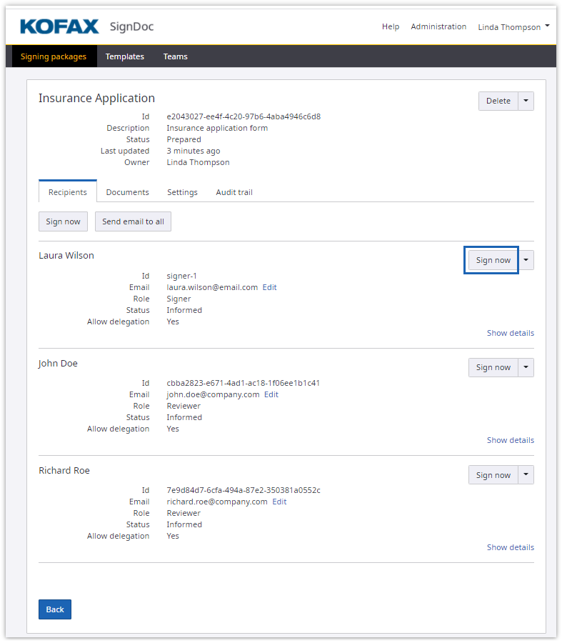 When preparing a signing package for in-person signing the Allow in-person signing switch must be enabled in package settings view.