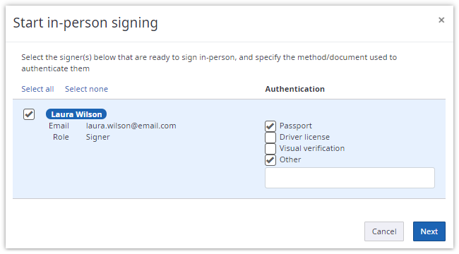 start the in-person signing session. Select one or more authentication mechanisms for each participant. You can also add a text