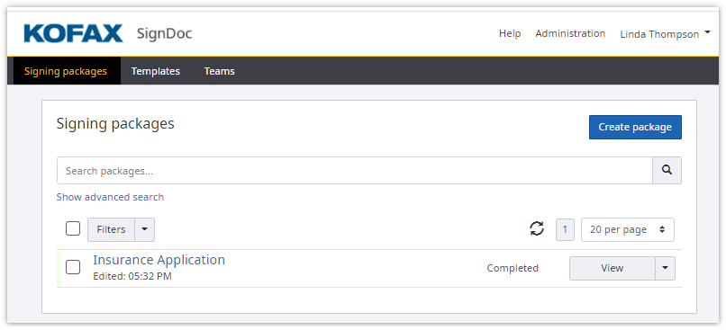 Use the SignDoc Standard central overview page to manage the user's signing packages and template packages. The Signing packages page offers the following features: