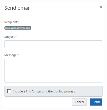 Type the email subject and body text (message to the recipient) and select the check box to include the link for signing. If no email address exists for the recipient, you can add it.
