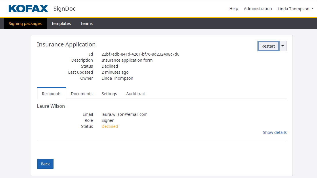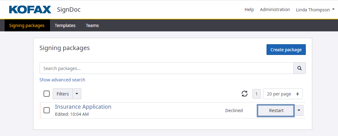 In case a signing package is declined by a recipient you can "Restart" the signing package as follows.