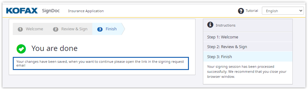 By default the signer is redirected to the finish page, if no specific URL is set in Administration settings for resuming later the external signing session.