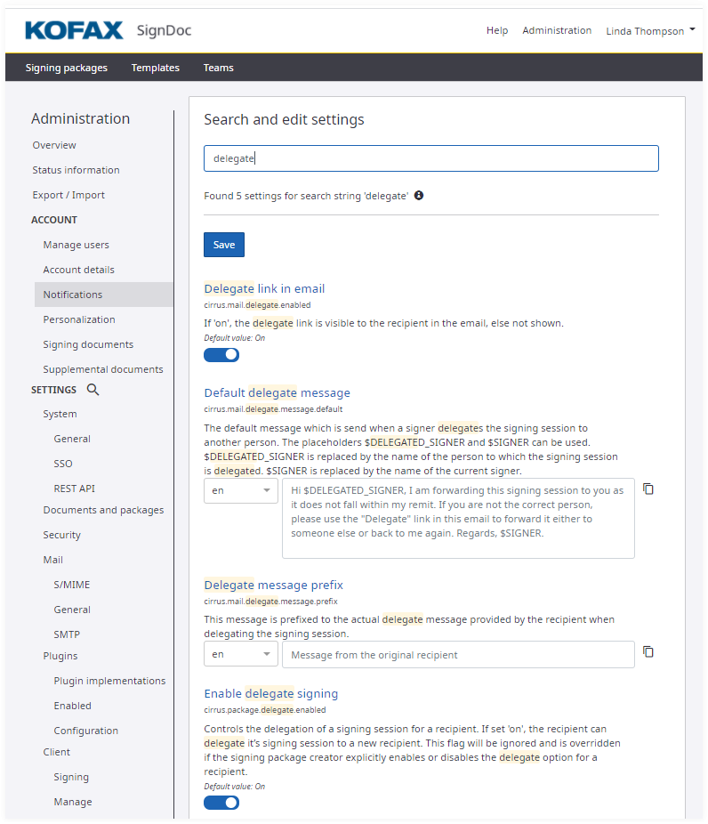 The "Search and edit settings" page opens where you can enter a search string. After typing in at least two characters, a case-insensitive search is started and displays a result list of settings which id, title, or description values match to the search string.