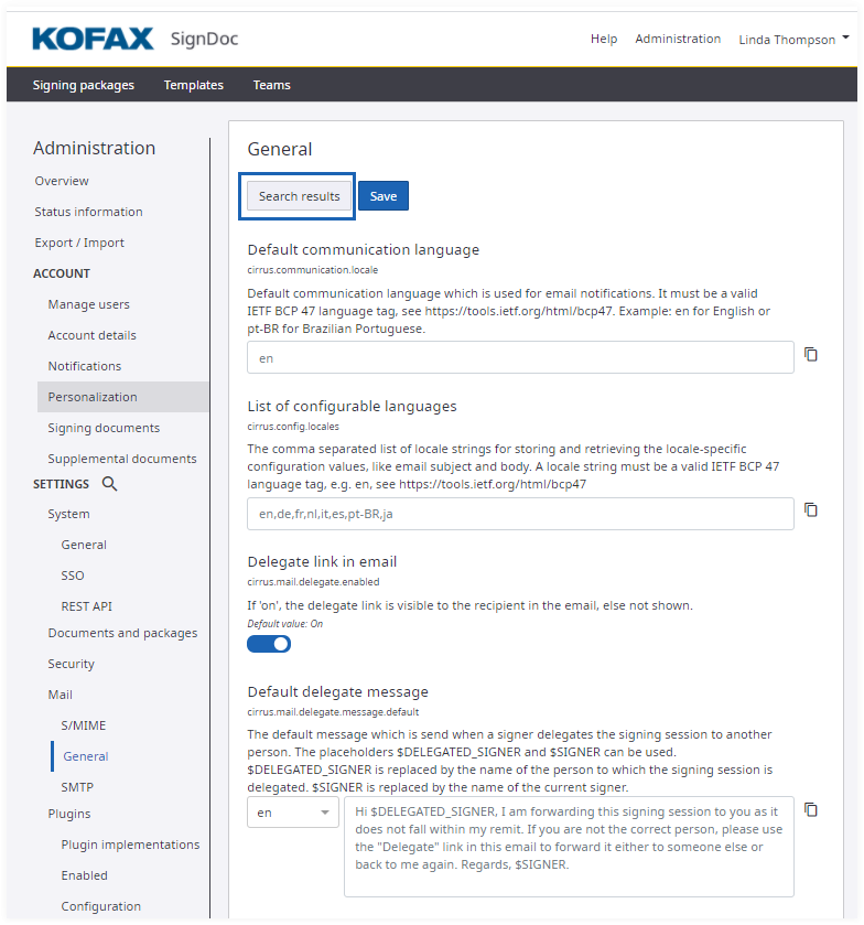 When entering a setting's category in this way, an additional Search results button is displayed that takes you back to the "Search and edit settings" page.