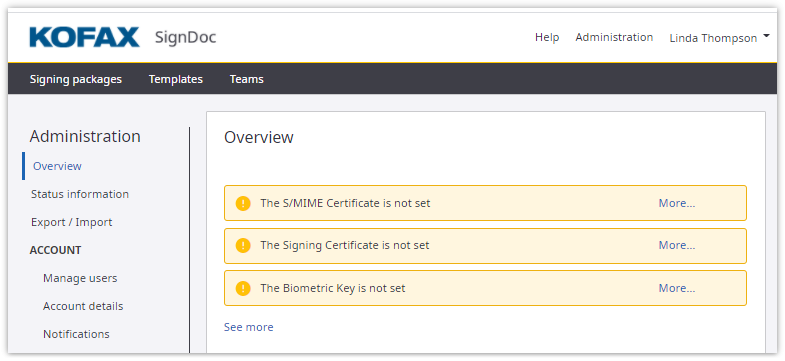 On the Signing documents page, an administrator can set preferences and configurations for this account that are specific to the actual signing of documents.