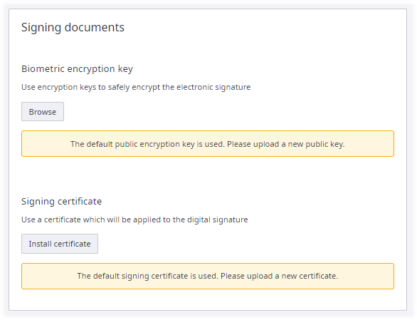 If no certificates are selected, a default self-signed certificate is used, and a warning appears on the administration overview page informing that the signing certificate is not set and instructing the administrator to update the signing certificate.