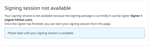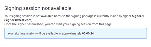 Only one signer can access a signing package at the same time. Other signers who want to access the signing package in parallel are forwarded to a page that acts as a waiting room for signers who can't access their signing sessions because the underlying signing package is in use by another signer. Once the signing session is available, a waiting signer can start it from this page.