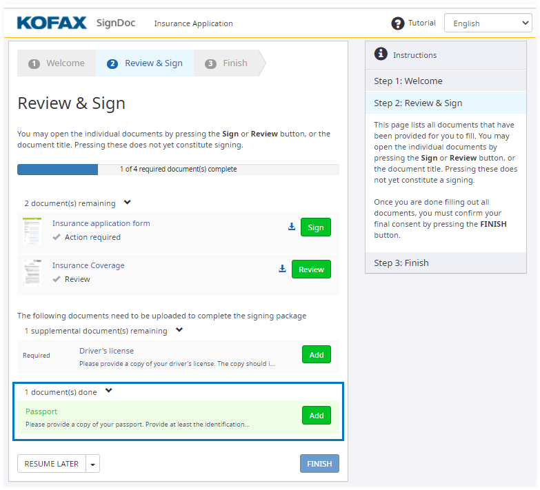 Once all required supplemental documents are provided and all documents of the signing package are completed, the Finish action is available for the signer.