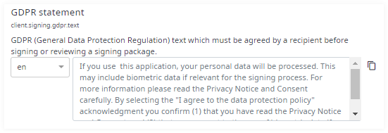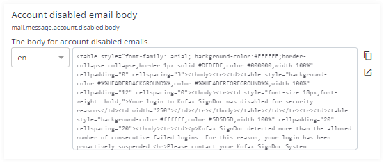 Use to enter a text or a number value for the current account. Default values are displayed as placeholder text (in Internet Explorer, default values are displayed on top of the input field). By entering a value for this account, the default value is overwritten. To use the default value you have to clear the text or the number of the input field. On the right there is an icon which copies the current value to the clipboard. This is useful when the current value is lengthy and handled better in an external text editor. Some of these text input elements are localizable. See Working with localizable strings for more information.