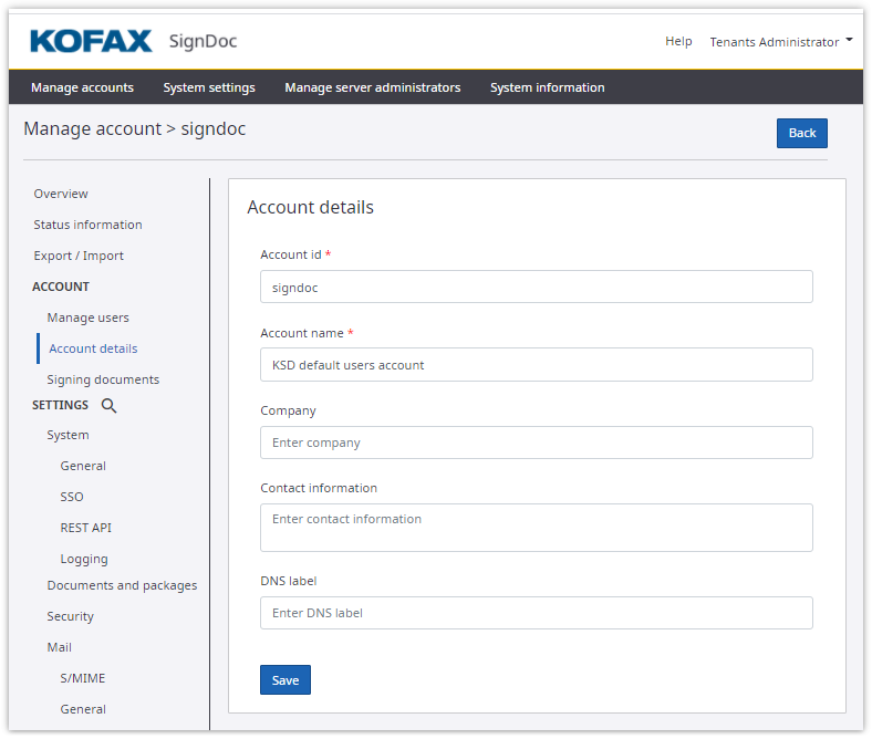 DNS label: Allows this SignDoc Standard account to be accessible via a subdomain. For example, if your company’s account should be accessible via the URL yourcompany.kofax-signdoc.com, the label "yourcompany" will appear in the DNS label field. This field is configured upon creation of this account by the server administrator and is not editable.
