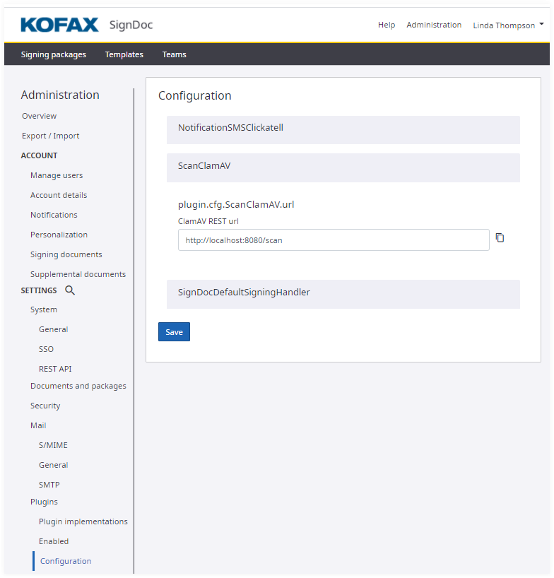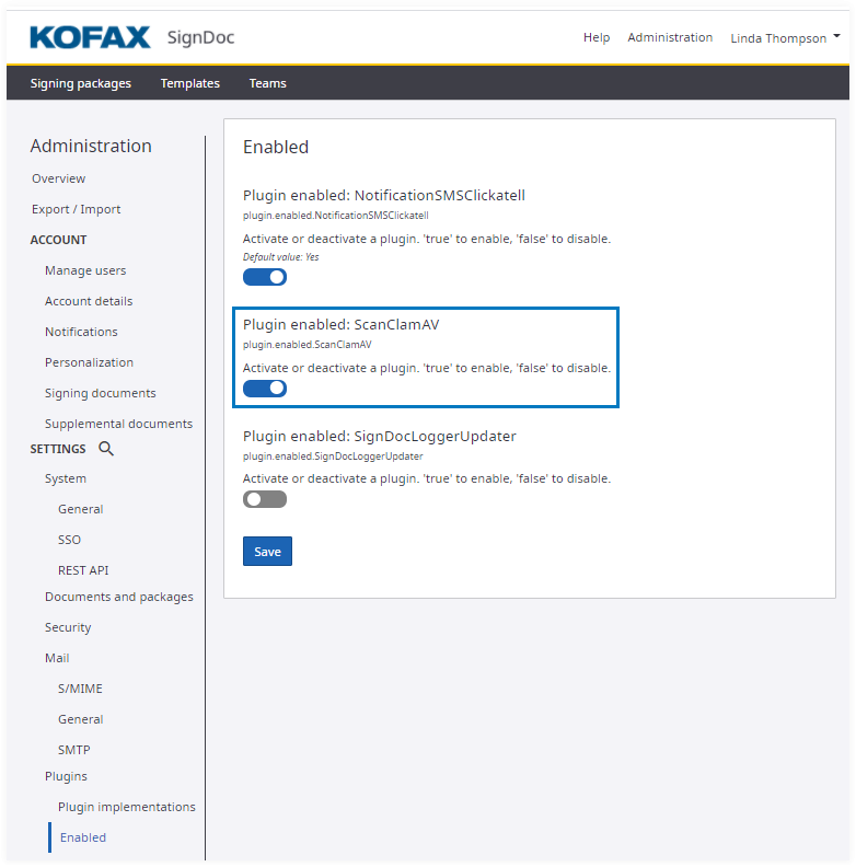 To make the plugin available for a different account, you must log in as an account administrator for the other account and repeat the process. You can use different settings for different accounts. In case of the ClamAV plugin, different accounts can use different ClamAV scanning servers.