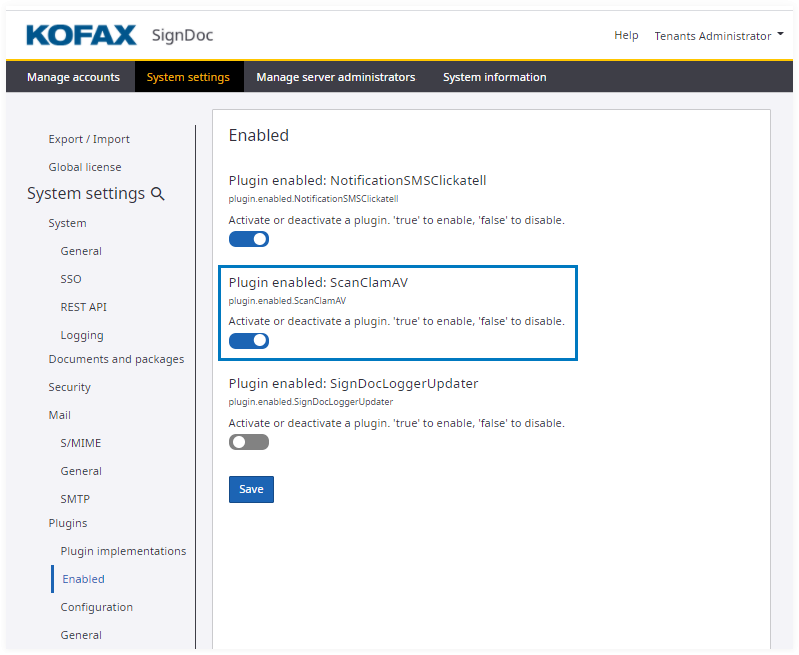 Slide the Plugin enabled: ScanClamAV setting to the right to activate it: