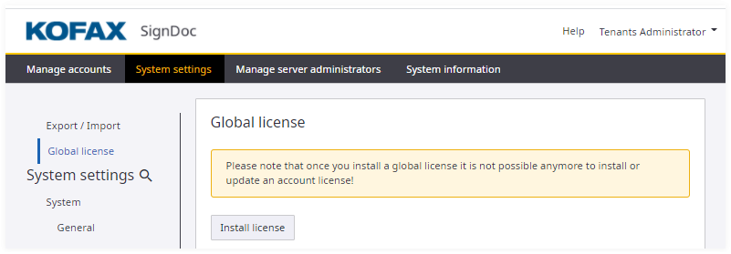 To install a global license, open the Administration Center, log in as a server administrator, go to the System settings link, and select the Global license category.