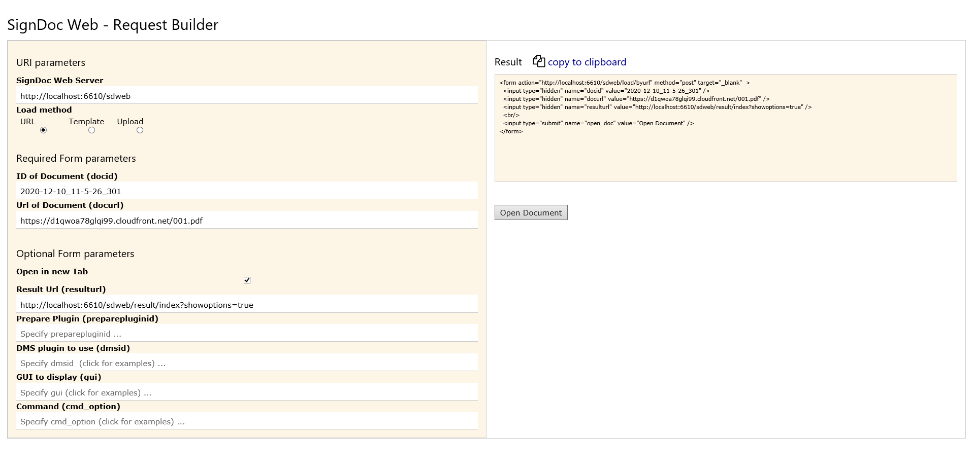 Whenever the user changed the request parameters in the left panel the result pane will update its content. The result pane shows the request as HTML form request that used as a template in a separate web application for opening documents. This is a major improvement compared with previous SignDoc Web versions (i.e. before SignDoc Web 2.2.0).