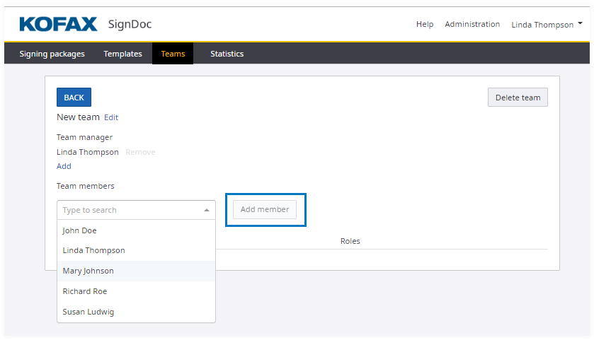 This functionality is only available when accessed by a SignDoc Standard user who is assigned to the team manager role or who is an account administrator.