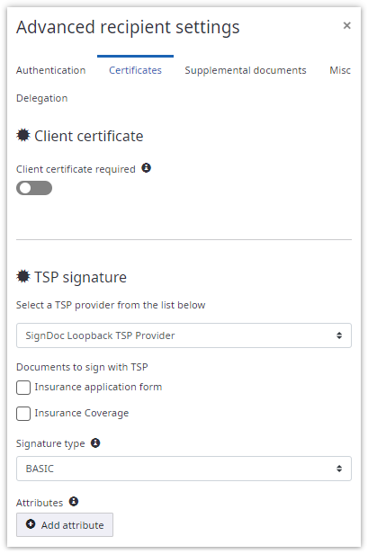 Here you can configure a TSP provider for the recipient. Depending on the TSP provider it is possible to provide a TSP signature for documents or for signature fields of the signing package. See TSP signature.