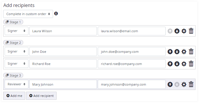 For more flexibility, recipients can also be assigned to stages. All recipients of a stage are invited (via email) at the same time. Recipients of a next stage are invited when all recipients of the previous stage are finished. Use the up/down arrows to assign the recipients to stages.