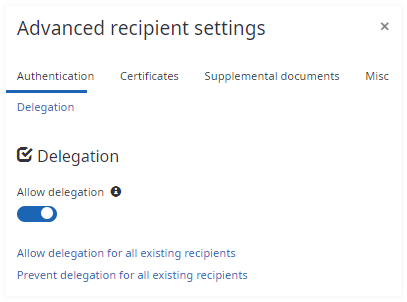 You can also use the action links Allow delegation for all existing recipients or Prevent delegation for all existing recipients to enable or disable the requirement for all currently existing recipients defined in the package. Please note that after adding new recipients to the package the action links must be triggered again.