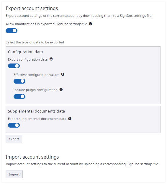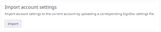 This page provides the possibility to export and import account settings. This can be used to backup account settings, to transfer settings from one account to another or to transfer account settings from one SignDoc installation to another.