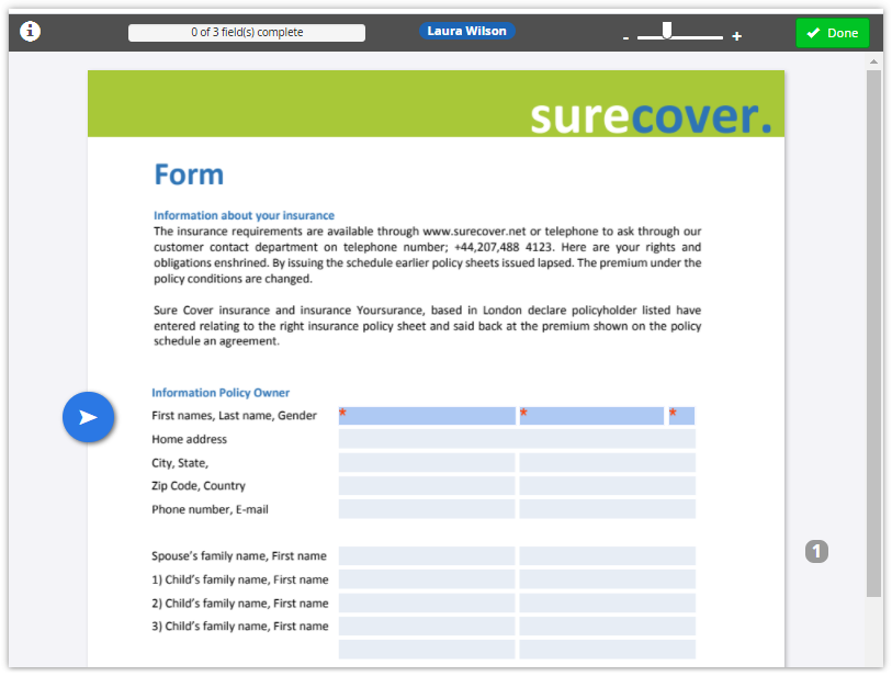 A form filling guide is displayed on the left side of the page to assist navigation to the fields of the document. On mobile devices, this guide is shown in the toolbar. The guide points users in the direction of the next field. You can also click the guide to automatically scroll there.