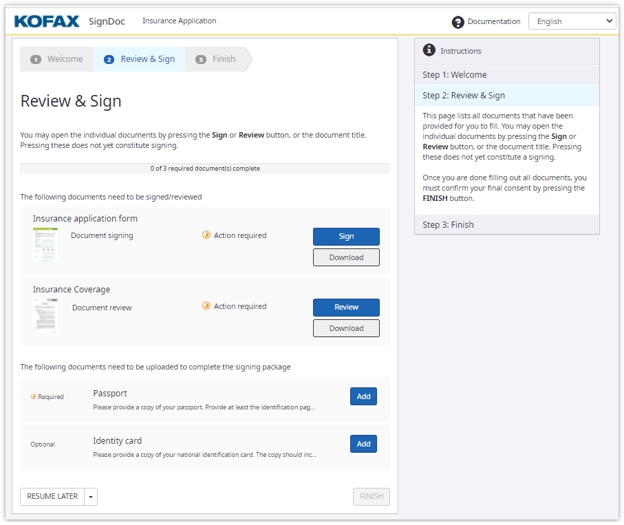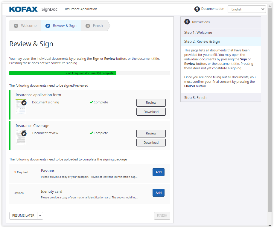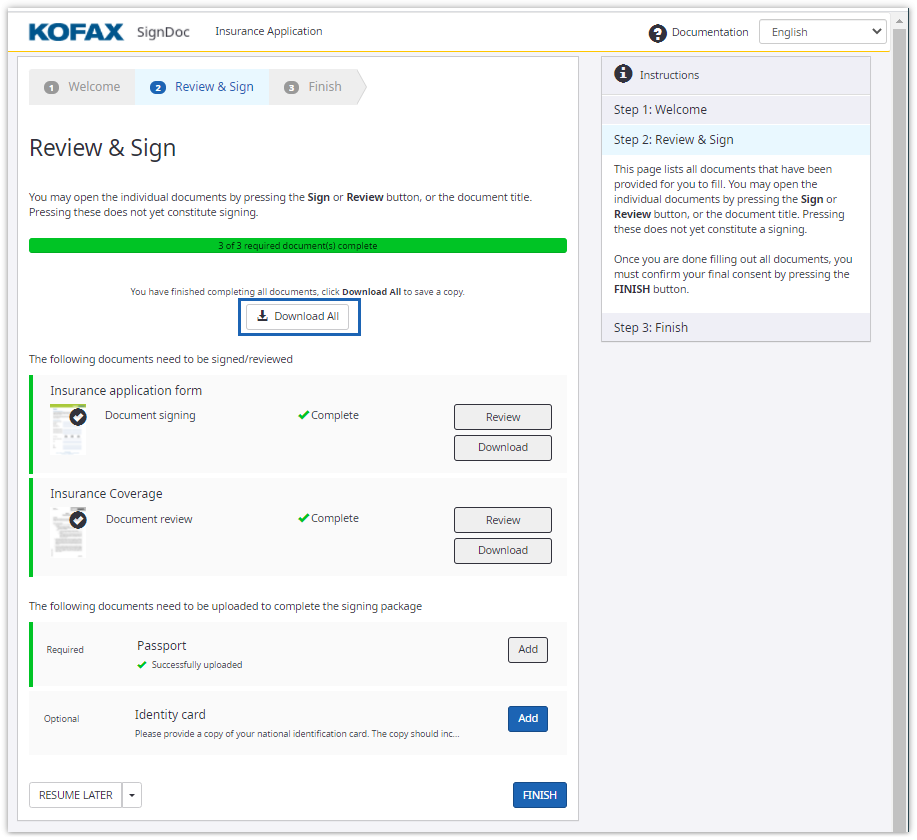 Click Finish if all required fields of all signer documents are completed and/or all documents have been reviewed by the reviewer. After users finish, they can no longer edit the documents in the package.