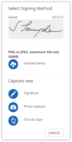 The signature image is stored on the computer or device that you are working on. You can delete the stored image by clicking the Delete link.This method appears: