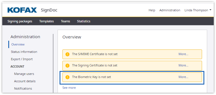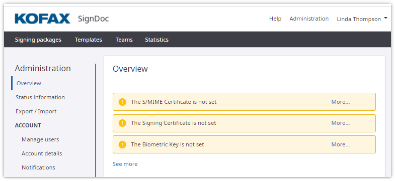 The possibility to select your own signing certificates allows an administrator to ensure that a certificate’s credentials match the account holder’s. This is particularly important for the final signed documents. When inspecting signed documents, the certificates selected here are displayed and the document is shown as having been signed by the owner of the certificates.