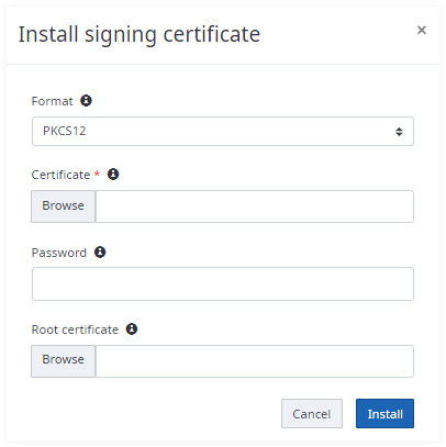 This is the digital signing certificate that is used for each SignDoc Standard signature placed in a document. Click Install certificate to browse the local file system to select and upload the digital certificates. Once uploaded, the selected certificates are used for all signing procedures.