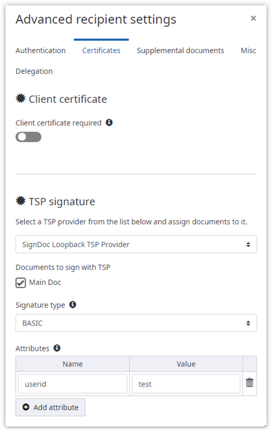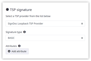 The available signature types and attributes of a TSP signature are related to the corresponding TSP signature provider used in the system.If no TSP provider is selected, no TSP signature is required for the recipient.