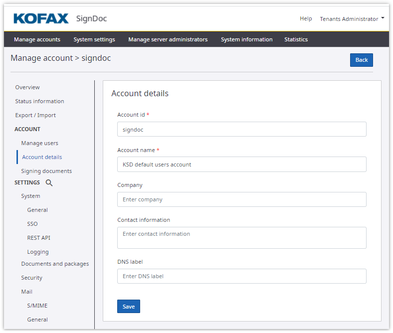 DNS label: Allows this SignDoc Standard account to be accessible via a subdomain. For example, if your company’s account should be accessible via the URL yourcompany.kofax-signdoc.com, the label "yourcompany" will appear in the DNS label field. This field is configured upon creation of this account by the server administrator and is not editable.