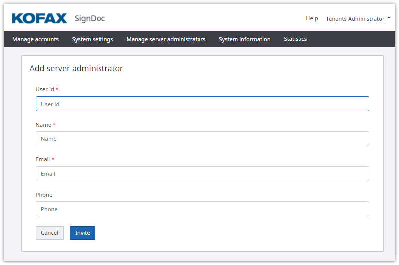 To create a server administrator, click Add server administrator on Manage server administrators page.