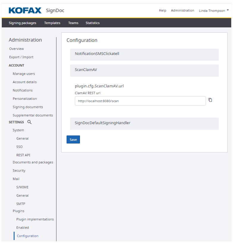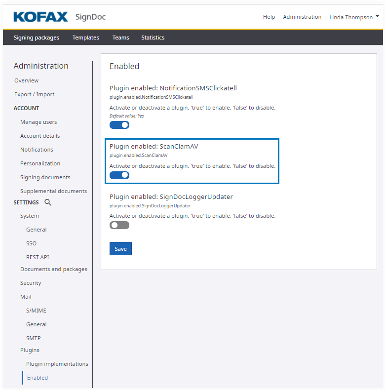 To make the plugin available for a different account, you must log in as an account administrator for the other account and repeat the process or set it in the Administration Center via Manage account. You can use different settings for different accounts. In case of the ClamAV plugin, different accounts can use different ClamAV scanning servers.