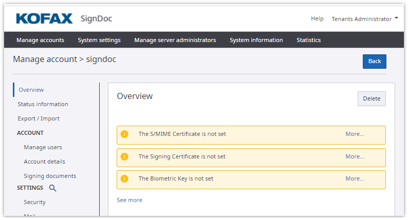 Each account has its own status information on certificates, licenses, keys, and connection. Specific account status information is presented in the Edit an account section.