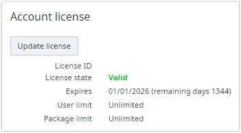 The Account license page provides an overview of the current license metrics, as well as an option to upload a new license (typically to renew, prolong, or upgrade the current account). To set a new license, click Update license to load the SignDoc Standard license file from your local computer’s file system.