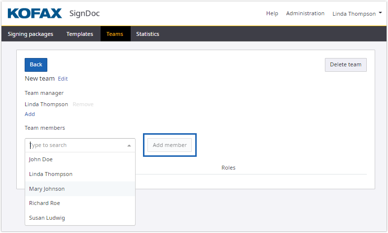This functionality is only available when accessed by a SignDoc Standard user who is assigned to the team manager role or who is an account administrator.