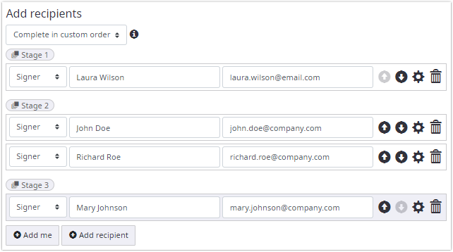 For more flexibility, recipients can also be assigned to stages. All recipients of a stage are invited (via email) at the same time. Recipients of the next stage are invited when all recipients of the previous stage are finished. Use the up/down arrows to assign the recipients to stages.