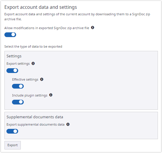 Account settings are exported by downloading a SignDoc settings zip file. Depending on the selected options, this zip file contains a configuration.json and/or a doctypes.json file which contain the exported data in JSON format.