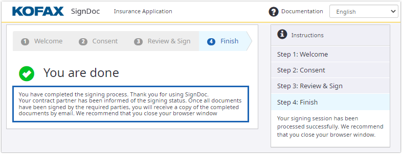 After the in-person or remote signing session is finished, a confirmation message appears on the Finish page by default. In this case we recommend that you close your browser window. For external signing session the specific URL could be set in Administration settings to redirect the recipient after the signing session is finished.