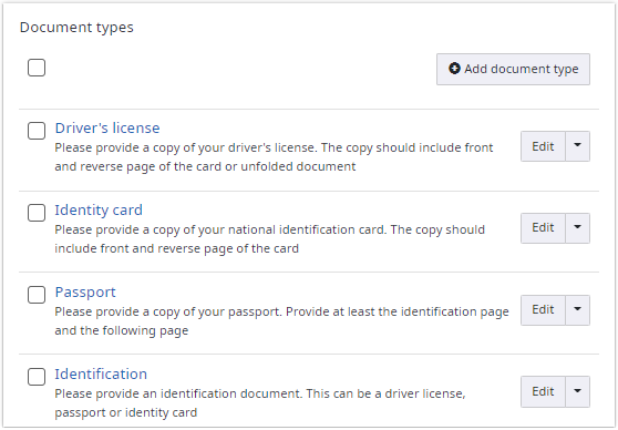 An account administrator can manage document types assigned to an account. A document type is a template which defines a group of supplemental documents.