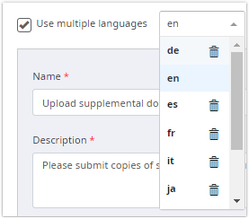 To add multiple translations to the document type, a user has to provide the English translation first. Then you can use the Use multiple languages check box to enable multiple translations for the document type. When selecting this option, the application displays the translation list. When you change the selected language and enter Name, Description and Max number of files, you enter the values for the selected language.