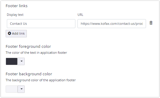 The links in the footer can be changed with the option Footer links. Add multiple links by clicking Add link to create a new link in the footer. Fill in your preferred information in the Display text and URL fields.