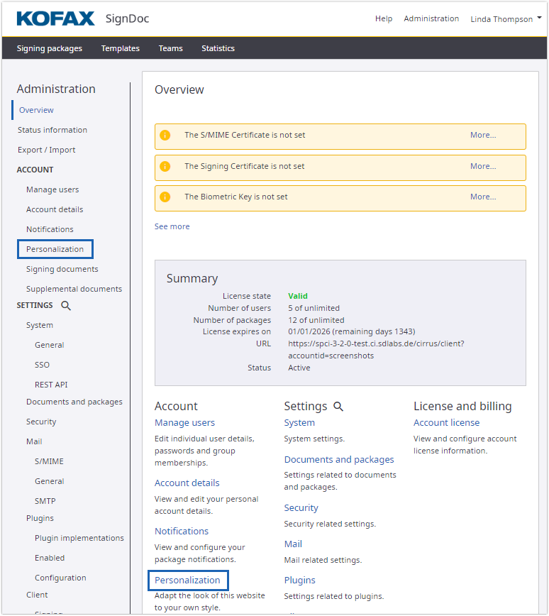 In the application header, click Administration. Now you can access the settings for personalizing an account in the Overview page under the Account section by clicking Personalization. Alternatively, you can click Personalization in the left navigation bar.