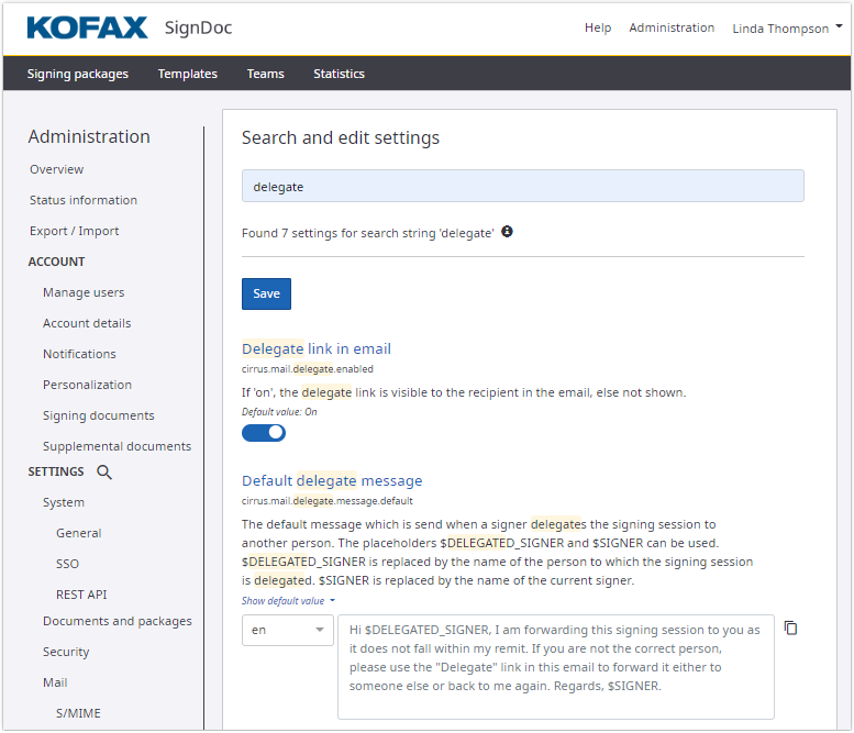 The Search and edit settings page opens where you can enter a search string. After typing in at least two characters, a case-insensitive search is started and displays a result list of settings which ID, title, or description values match to the search string.