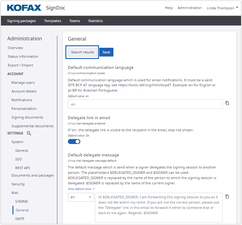 When entering a setting's category in this way, an additional Search results button is displayed that takes you back to the Search and edit settings page.