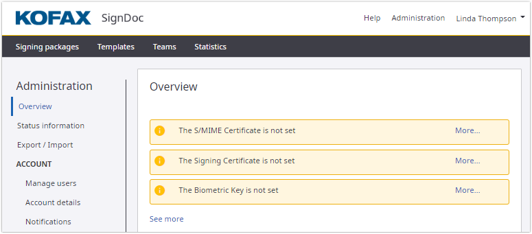 The possibility to select your own signing certificates allows an administrator to ensure that a certificate’s credentials match the account holder’s. This is particularly important for the final signed documents. When inspecting signed documents, the certificates selected here are displayed and the document is shown as having been signed by the owner of the certificates.