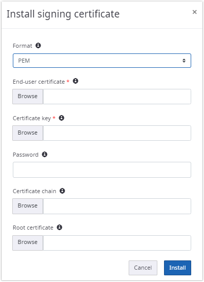 This is the digital signing certificate that is used for each SignDoc Standard signature placed in a document. Click Install certificate to browse the local file system to select and upload the digital certificates. Once uploaded, the selected certificates are used for all signing procedures.