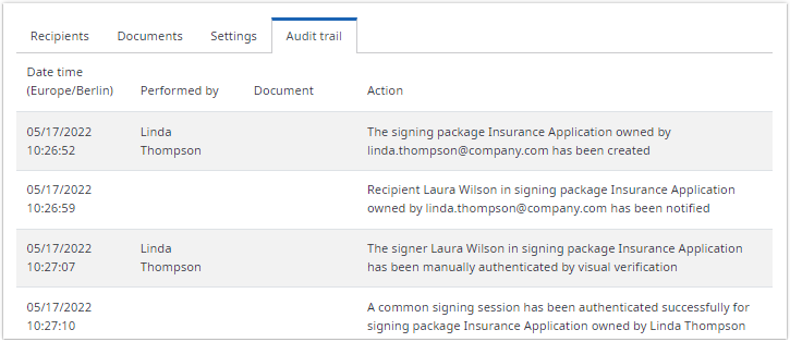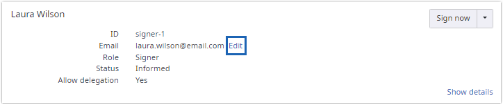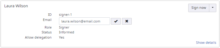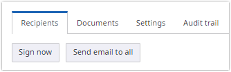 In the Recipients tab, a user can start the Sign now process if a package is available for signing. For details, see In-person signing session.