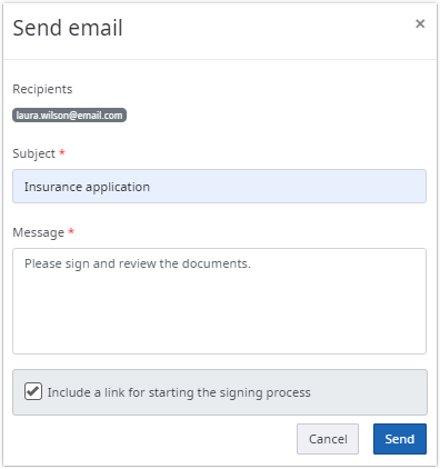 After filling out the mandatory fields and before sending the mail, the check box to include a link for starting the signing process can be selected.