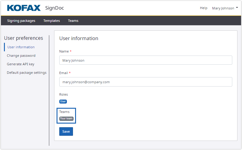 A user can be a member of various teams. SignDoc Standard lists the membership for users on the User information page.