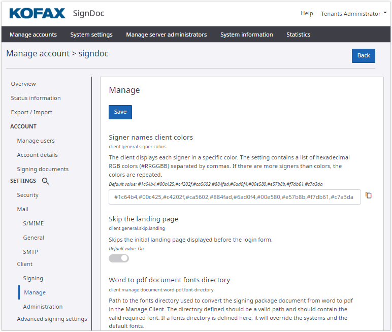 The System settings menu displays settings related to the system, documents and packages, security, mail, plugins, signing, and the global license.